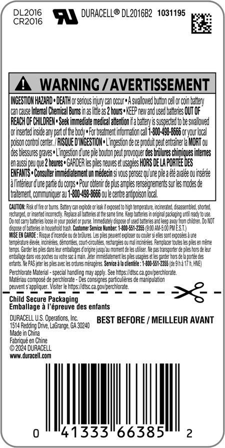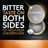 Duracell has a tradition of investing in the extensive development of features that can help keep children safe, especially for its Lithium Coin batteries. With its latest innovation the CR 2032, CR 2025, and CR 2016 3 Volt cells are bitter on both sides! The non-toxic bitter coating on the cell that is designed to help discourage swallowing, is now applied on both sides of the cell, to help keep children safe.