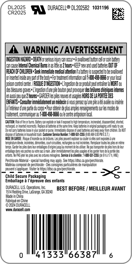 Duracell has a tradition of investing in the extensive development of features that can help keep children safe, especially for its Lithium Coin batteries. With its latest innovation the CR 2032, CR 2025, and CR 2016 3 Volt cells are bitter on both sides! The non-toxic bitter coating on the cell that is designed to help discourage swallowing, is now applied on both sides of the cell, to help keep children safe.